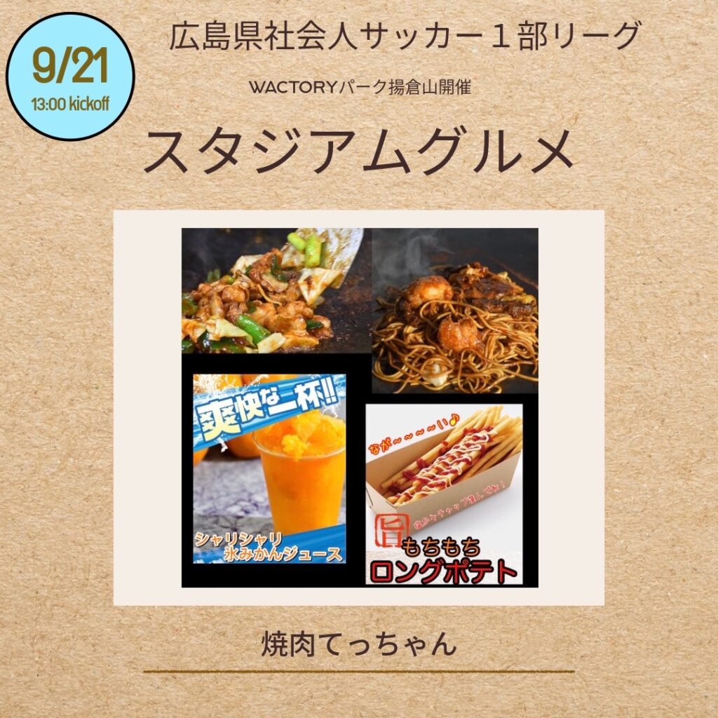 9月21日(日)@WACTORYパーク揚倉山で行われます広島県社会人サッカー1部リーグにおいて、サポーターやご来場の皆さまにより一層楽しんでいただけるよう、試合会場にて飲食の出店を行うことが決定いたしましたのでお知らせいたします。