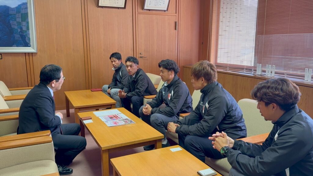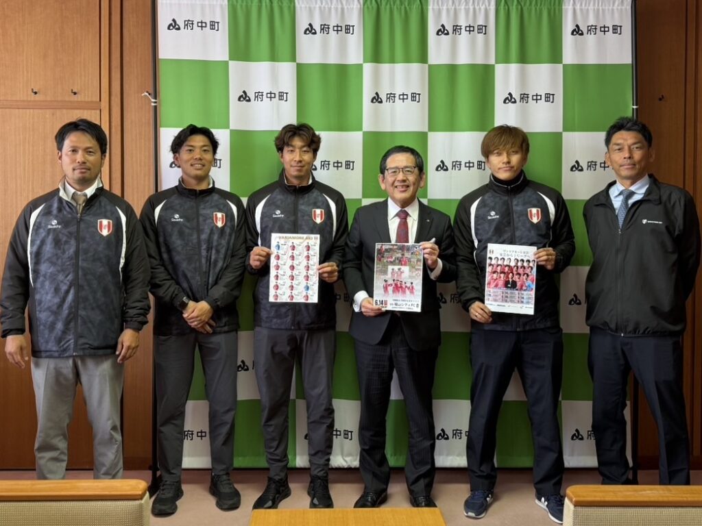 この度、6月14日(日)に開催される「中国サッカーリーグ第10節 vs 福山シティFC」の試合告知ならびに試合へのご招待のため、府中町長 寺尾光司様を表敬訪問いたしました。