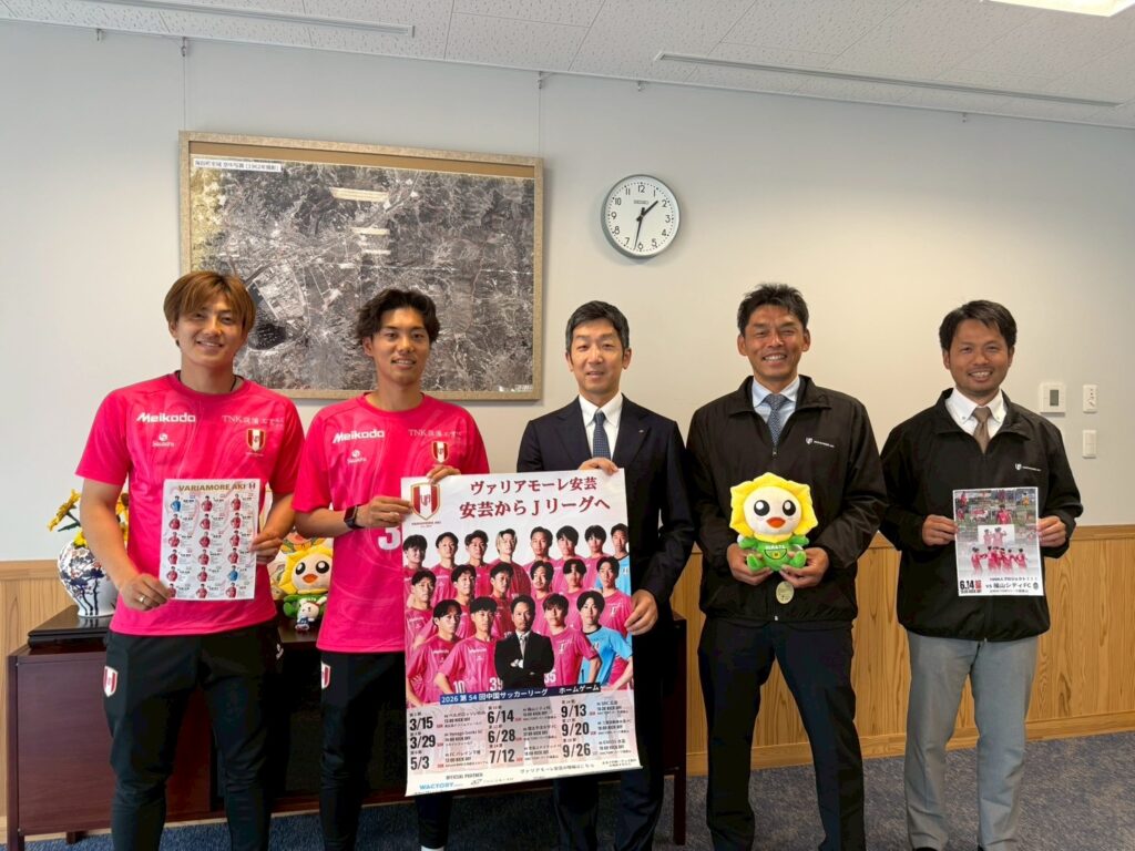 この度、6月14日(日)に開催される「中国サッカーリーグ第10節 vs 福山シティFC」の試合告知ならびに試合へのご招待のため、海田長 竹野内啓佑様を表敬訪問いたしました。