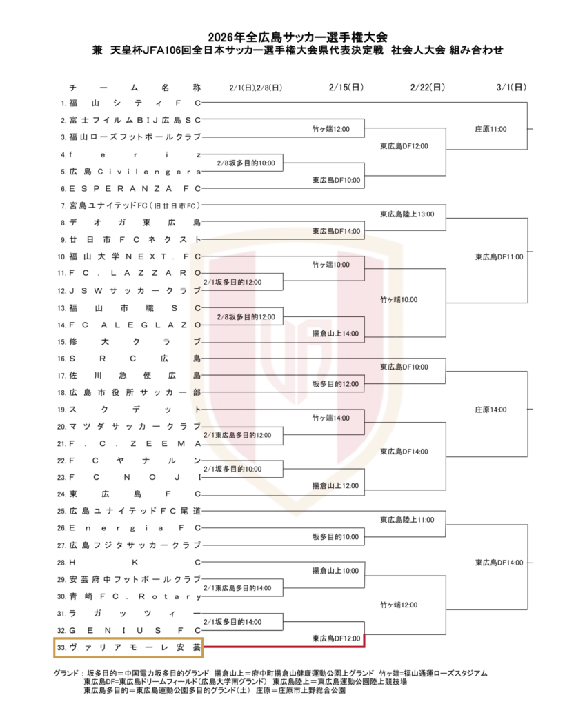 2月1日(日)から行われる2026年全広島サッカー選手権大会兼天皇杯JFA104回全日本サッカー選手権大会県代表決定戦 社会人大会日程のご案内です。なお、ヴァリアモーレ安芸はシードでのスタートとなり、初戦は2月15日(日)となります。