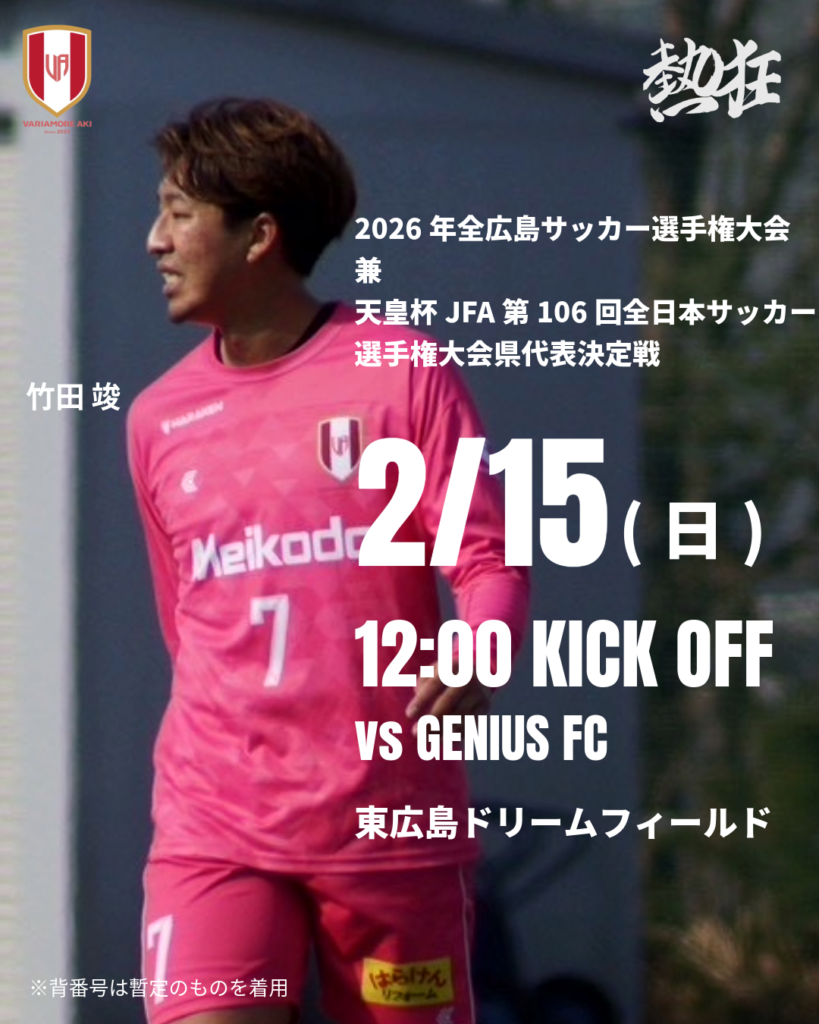 2月1日(日)から行われる2026年全広島サッカー選手権大会兼天皇杯JFA104回全日本サッカー選手権大会県代表決定戦 社会人大会日程のご案内です。なお、ヴァリアモーレ安芸はシードでのスタートとなり、初戦は2月15日(日)となります。