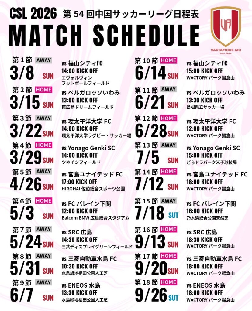 2026年度 第54回中国サッカーリーグの日程が決まりましたので、お知らせいたします。