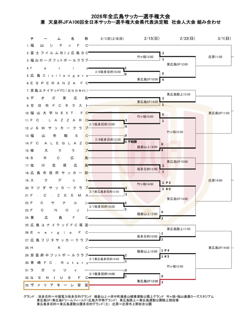 2月22日(日)に行われます、2026年全広島サッカー選手権大会兼天皇杯JFA104回全日本サッカー選手権大会県代表決定戦 社会人大会 2回戦の試合は、以下のとおり行われます。